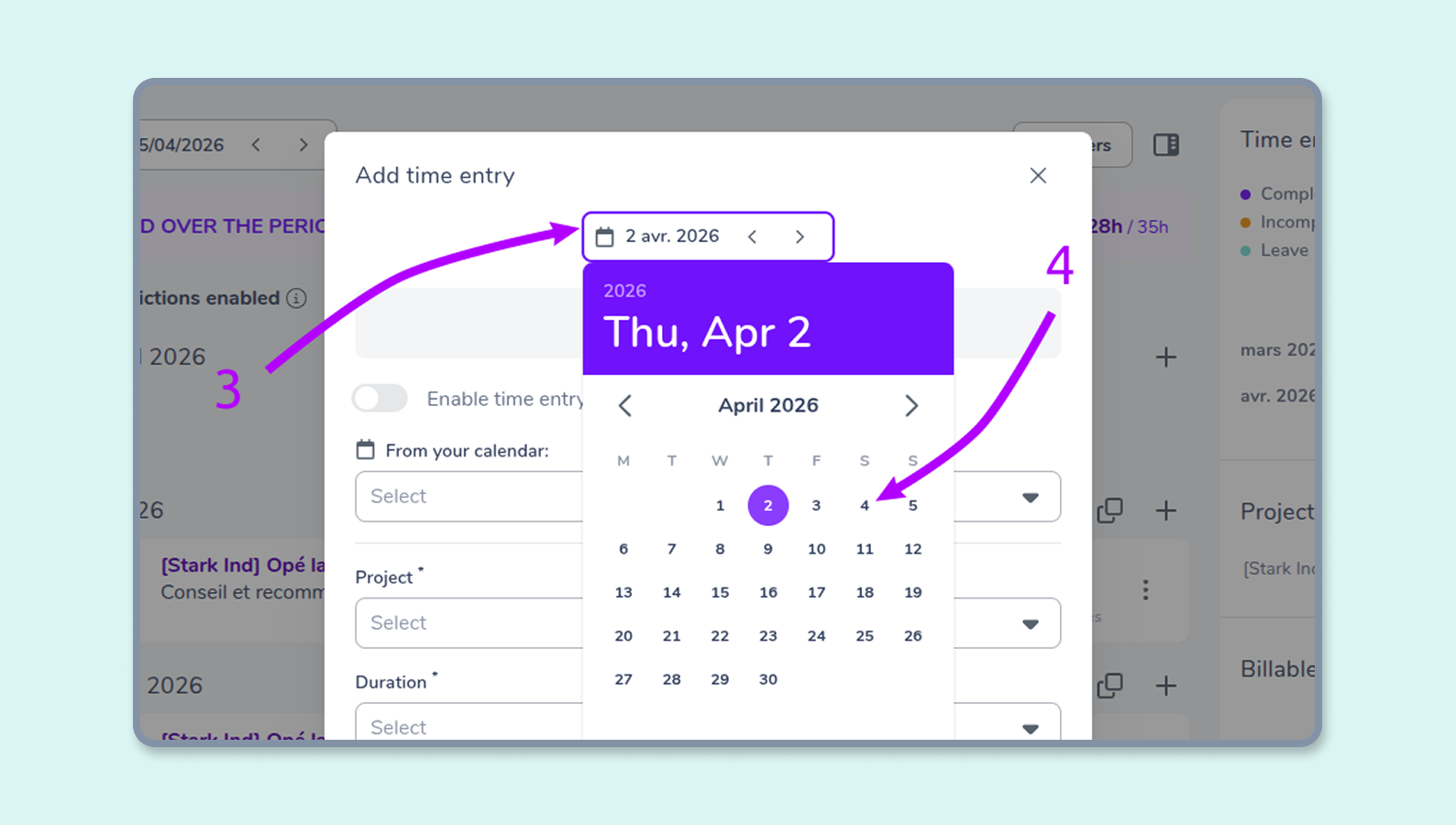 If you want to log time for a past or future day, use the date picker in the declaration window to select the desired day.