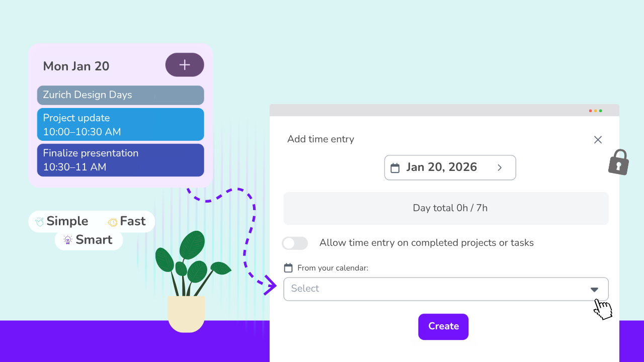 Simply select the event — your time entry is pre-filled.