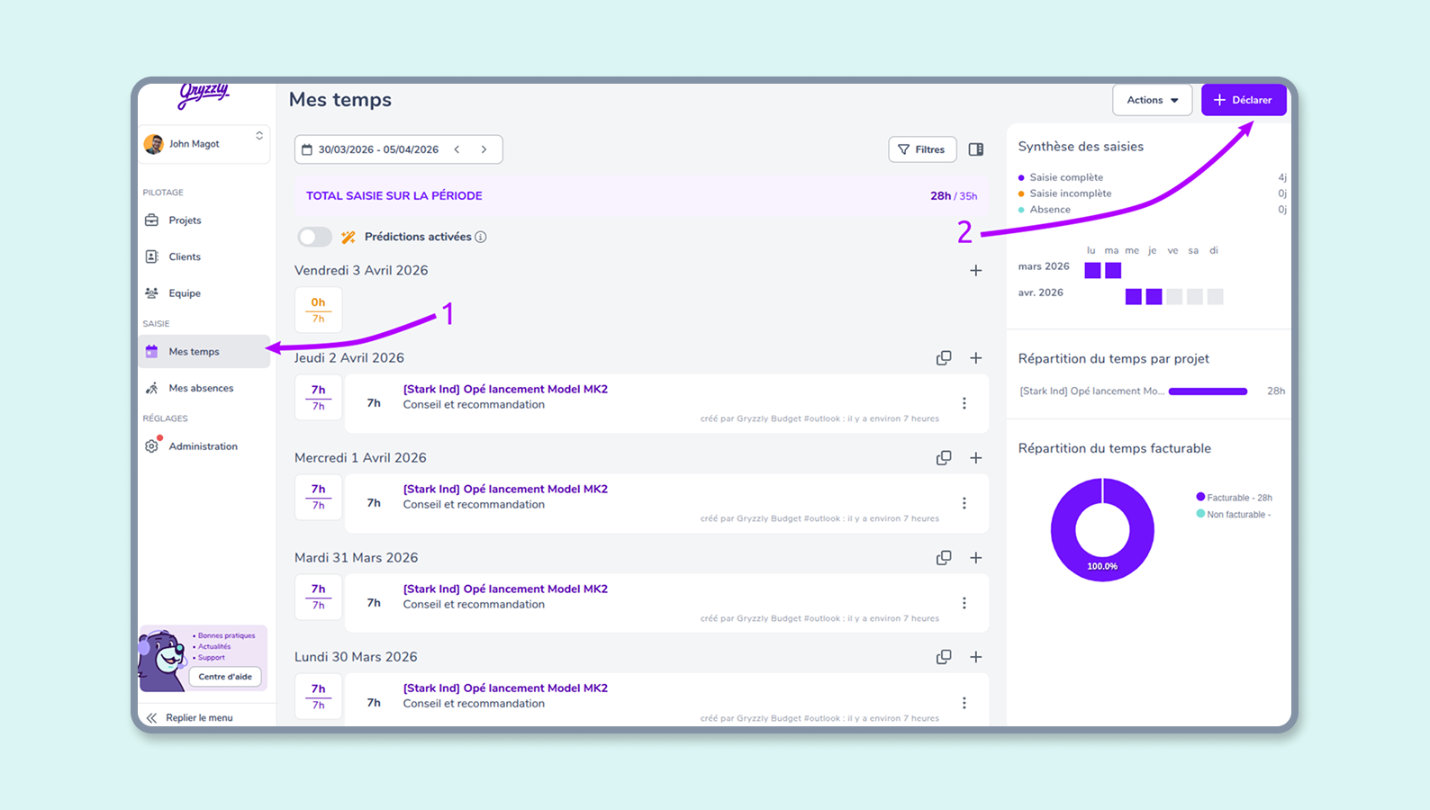 Dites simplement “Bonjour” à Gryzzly pour saisir sur le jour en cours, même durant le weekend.